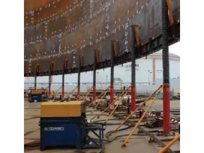 (l)圆周罐壁内侧均匀分布22个支撑点,每个支撑点与提升架之间、提升架与底板之间垫长650mm、宽650mm、厚20mm的钢板且满焊,焊脚高度10mm。每个提升架与垫板焊接的稳定性影响整个罐体提升的稳定,平稳垂直固定并在其朝向塔中心面的两侧用2根斜支撑槽钢加固,各提升架横向使用槽钢连接成整体。必要时可增加1根连到中心的径向水平拉绳(钢丝绳),使所有提升架呈辐射形连接。这样的布置方式既可使单个提升架有足够的刚度,又使所有提升架形成封闭系统,充分保证提升系统的稳定性。